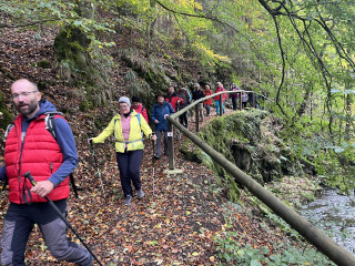 Einer der schönsten Wanderwege in Nordbayern der Thiesenring um Bad Berneck war Ziel der Herbstwanderung des Skiclubs Pistenschwinger Gössenreuth. Nach der Anreise mit dem Bus wanderte die Gruppe zunächst durch den dendrologischen Garten, einem Park mit Bäumen aus aller Welt. Vorbei ging es am gelassenen Bergwerk „Beständiges Glück“, wo Alexander von Humboldt einst seine selbst entwickelte Grubenlampe testete. Der Pfad hinauf zum Sonnentempel war flankiert mit kulturhistorischen Thementafeln sowie Tafeln mit Zitaten und Aphorismen und ist auch als „Weg der guten Gedanken“ bekannt.
