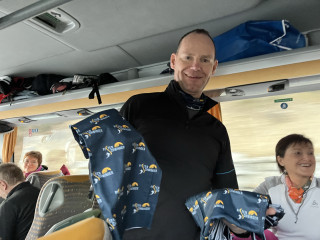 Ein Schlauchschal (Buff) mit dem neuen Logo des Skiclubs Pistenschwinger war das Begrüßungsgeschenk von Vorsitzenden Harald Friedrich an die mitreisenden Sportler.
